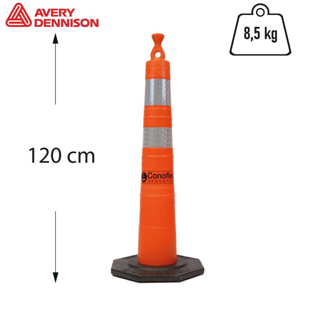 Cono de señalización vial de 120 cm de altura, fabricado en material polietileno semirrígido, con filtro UV para protección solar. Conformado en “2 piezas” llamadas: Cono y Base de Contrapeso. Cuenta con un mango anatómico para su fácil manejo e incluye una perforación para pasar cadenas plásticas o cintas perimetrales. Presenta 2 bandas reflectivas, una de 15 cm de ancho y otra de 10 cm de ancho, con características HIP (HIGH INTENSITY PRISMATIC) según normas IRAM ASTM D4956 Tipo-3. Las mismas se encuentran bajo relieve de 0,5 cm para su mayor protección. El cono sin su base de contrapeso, tiene un peso de 2 kg. Base de contrapeso: La base está fabricada en material PVC flexible de color negro, conformada en “una sola pieza” de forma octogonal, de 45 cm entre caras opuestas, una altura de 3 cm y un peso de 5,6 kg±0,2 kg. El peso total del cono con su base de contrapeso es de 8,5 kg+/- 0.2 KGRS